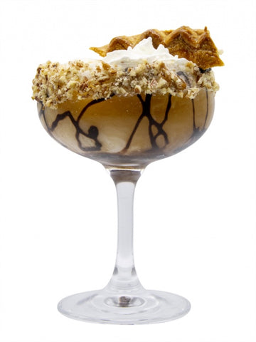 Chill a serving glass to start. Pour ingredients into mixing glass with 2/3 ice in order listed. Cap shake and strain into chilled glass. Garnish with a scoop of vanilla ice cream, chocolate drizzle and chopped pecan.